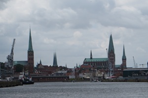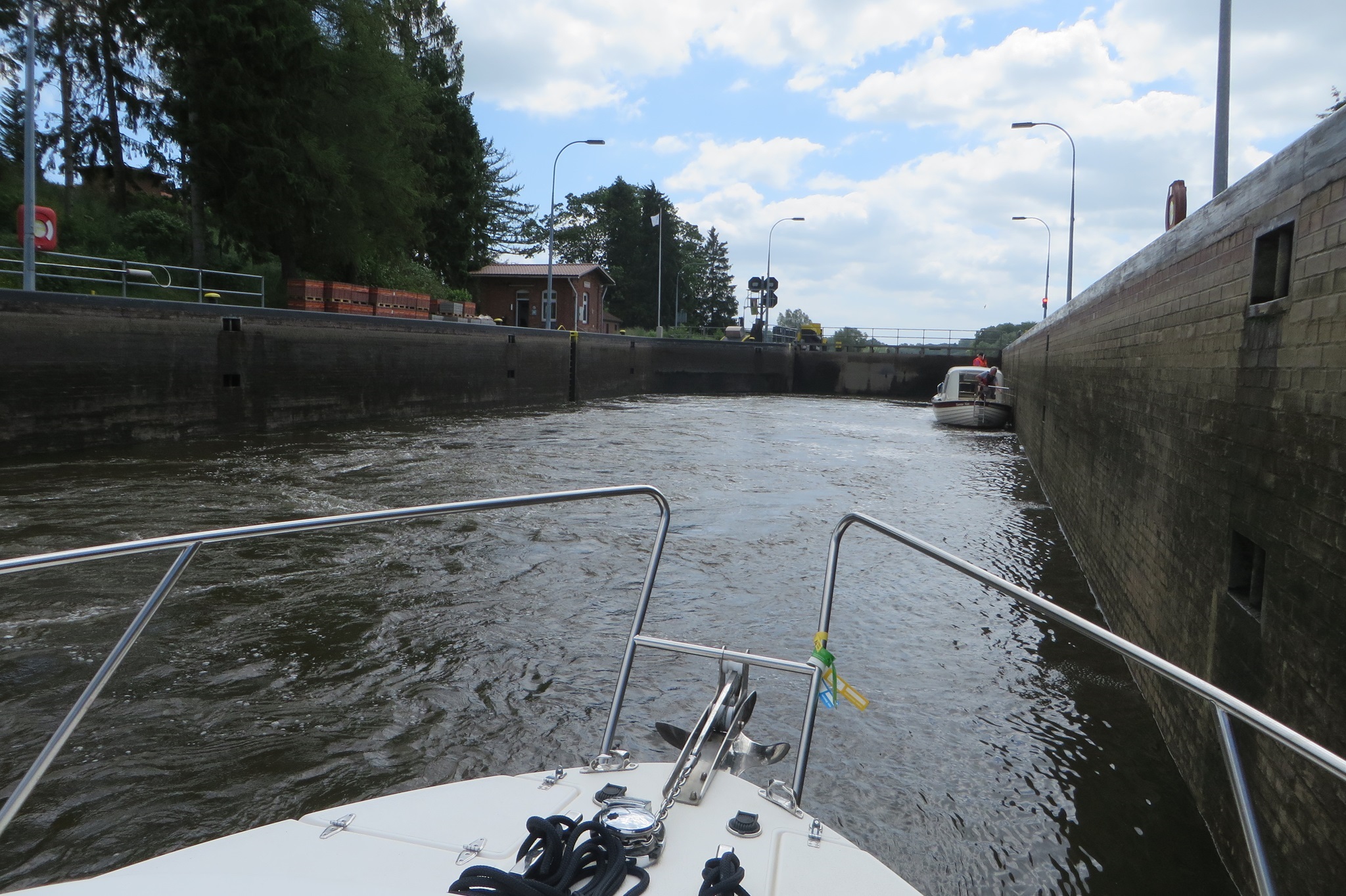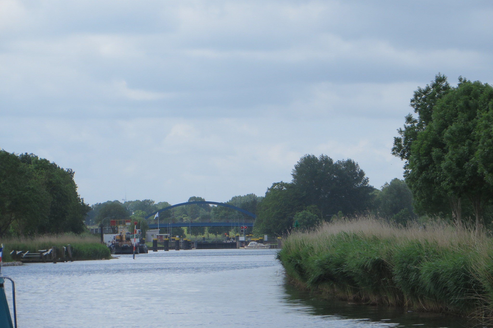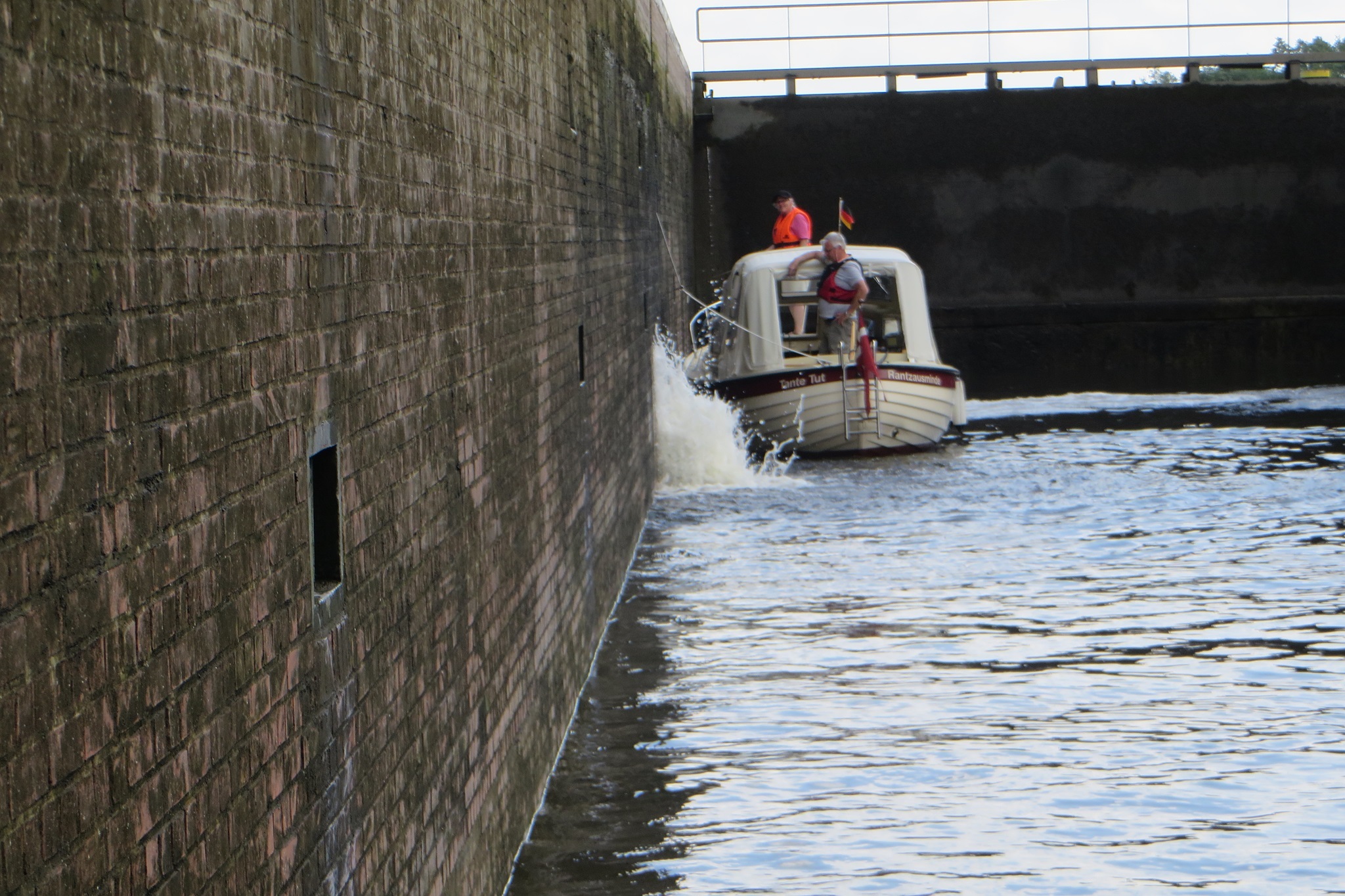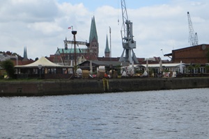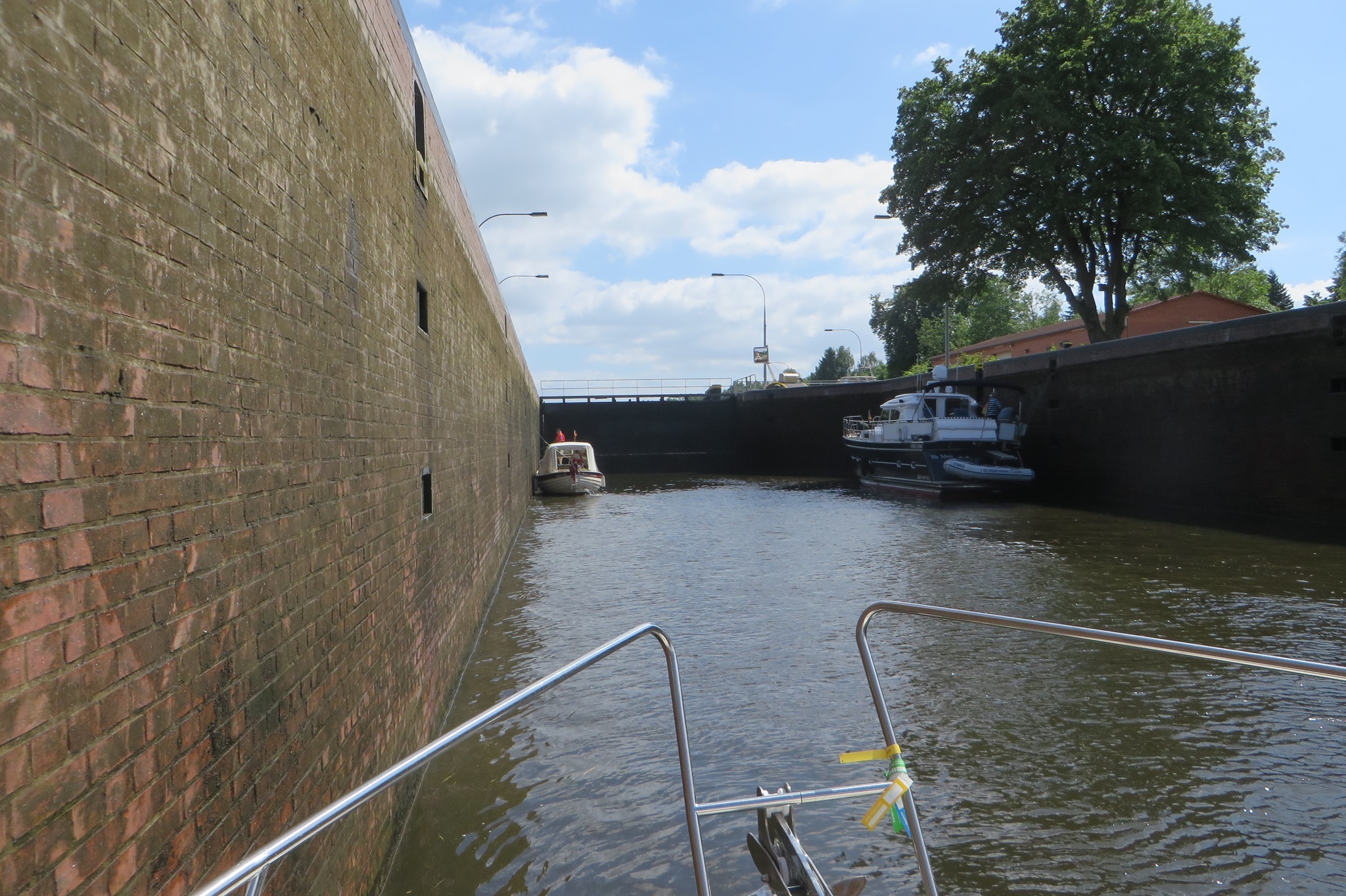 Wir sind langsam die Trave rauf geschippert. Durch Lübeck durch, bis wir an der ersten Schleuse dann eine 3/4 Stunde Pause einlegen mussten.
