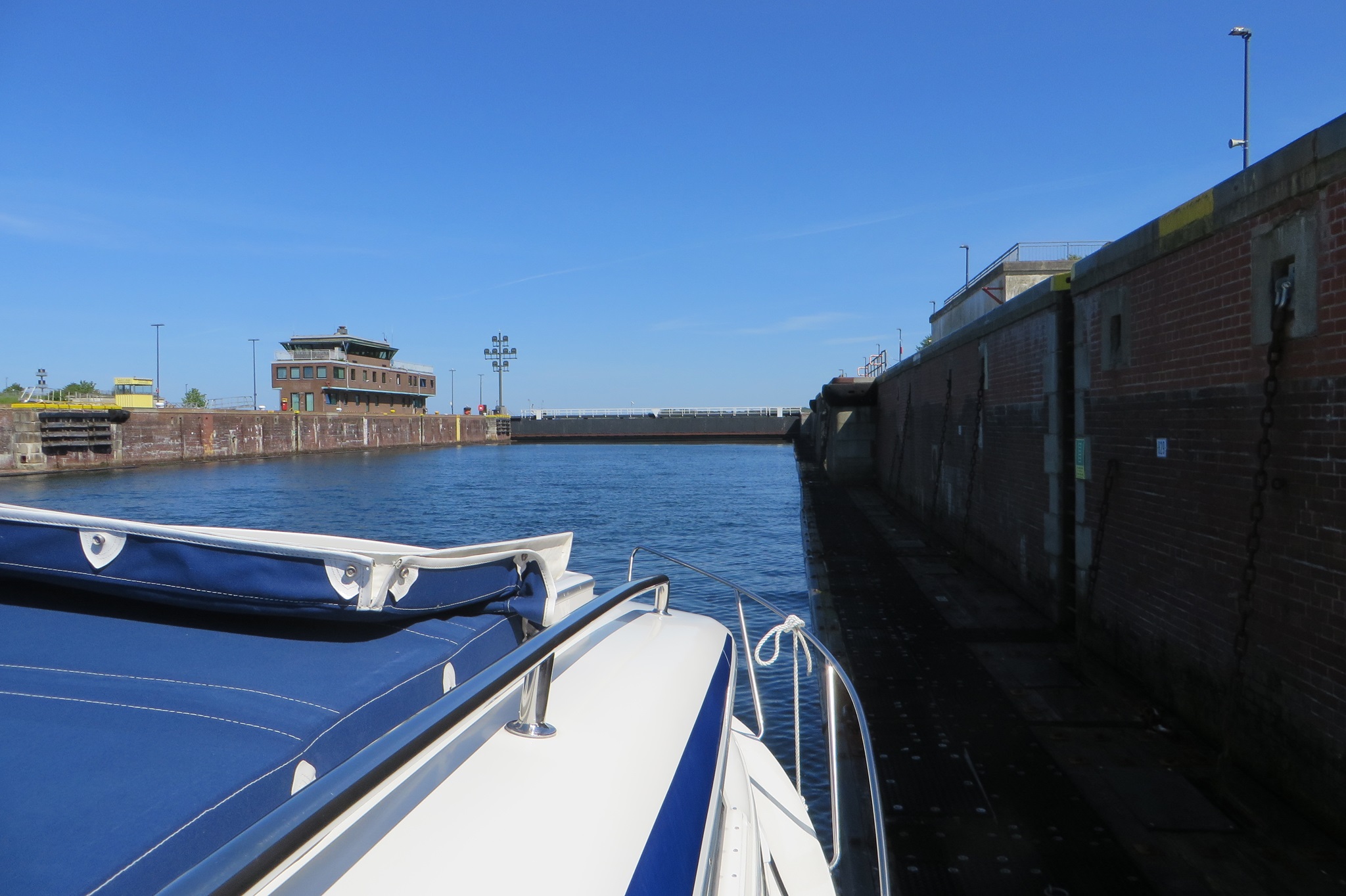 Als wir um die Ecke zur Kielschleuse kamen, sahen wir von weitem schon, das diese offen war. Das Sportboot vor uns hatte versucht sich über Funk anzumelden, aber das nicht hinbekommen. Ich hatte das dann selbst gemacht. Der Schleusenmeister war schon von den Versuchen des anderen Boots ein wenig genervt, hatte uns dann aber mitgenommen (und das andere Boot auch noch). Somit waren wir in der Riesen Schleuse mit zwei Sportbooten alleine.