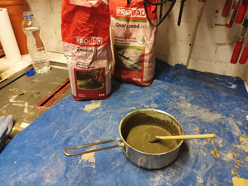 Ich nehme dazu normalen Zement aus dem Baumarkt (kein Blitzzement) und Quarzsand. Gemischt im Verhältnis 1:1.