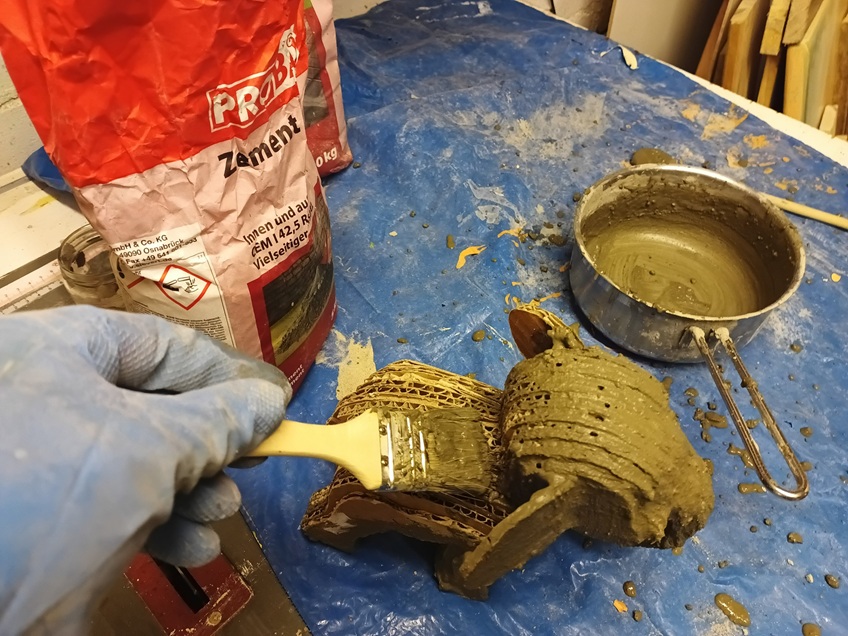 Aber dann habe ich mir gedacht, bau die doch in klein, aus Pappe und Zement.