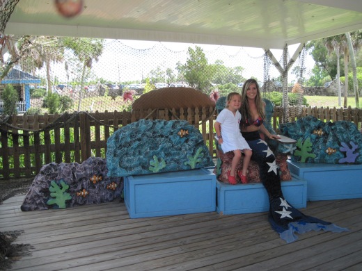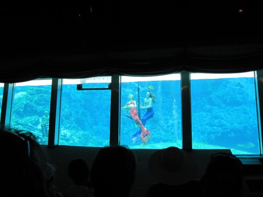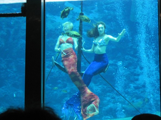 Die Meerjungfrauen haben keine Tauchflaschen oder ähnliches. Es liegen so eine Art Gartenschläuche da rum, aus denen die zwischendurch mal Luft holen. Zuerst gab es eine Show, wie das ganze funktioniert.