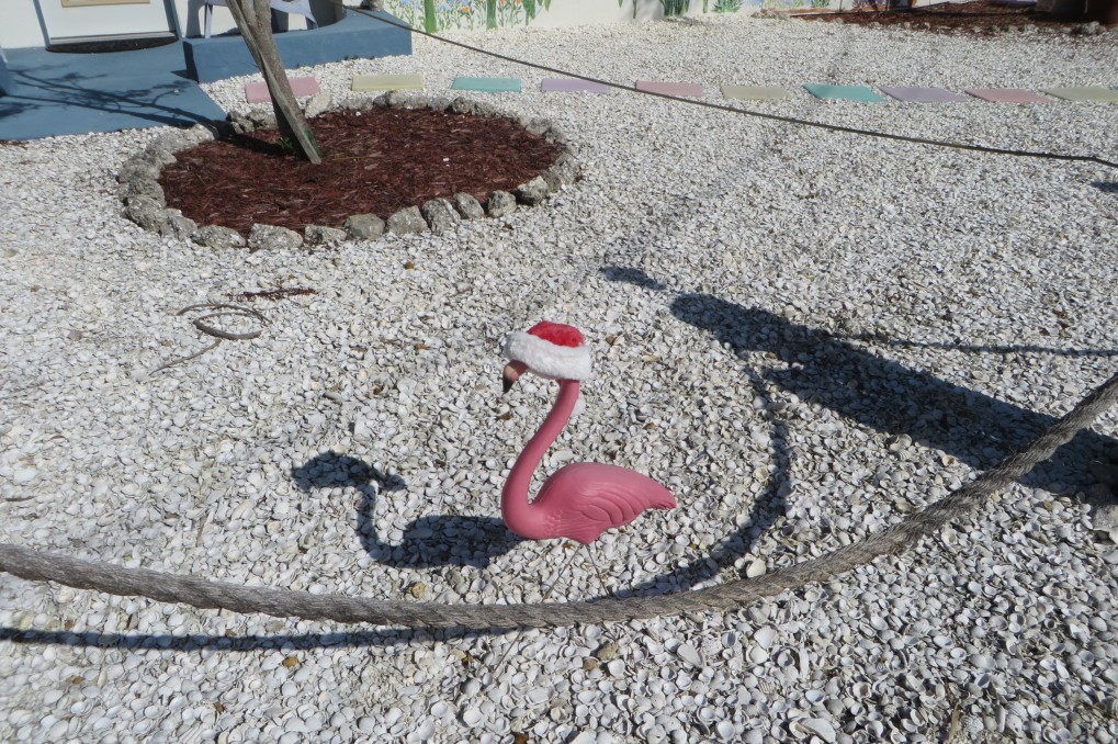 Auch hier in der Sonne fahren die Leute total auf Weihnachten ab. Selbst die Plastik Flamingos haben eine Mütze auf.