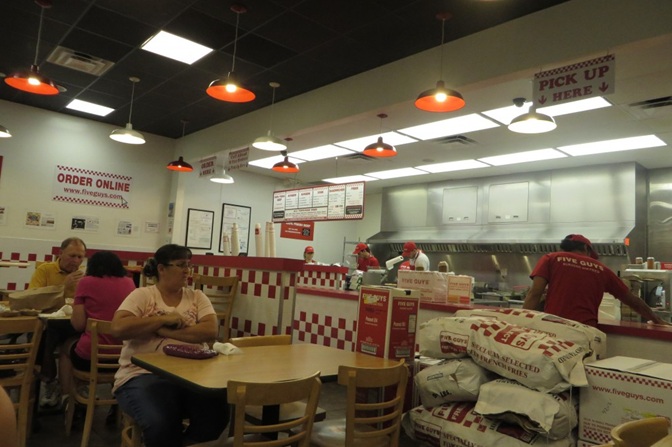 Wir wurden von unseren Freunden ja angewiesen, es diesmal doch mit Fastfood zu probieren. Und zwar mit der Five Guys Kette. Es gibt hier nur einen kleinen, oder einen großen Burger und Pommes. Alles andere wird von der Zubehörliste dazu gekauft. Die Jungs sind besonders stolz darauf, das alle Burger richtig frisch sind. Also kein tiefgefrorenes Fleisch. Waren auch echt gut.