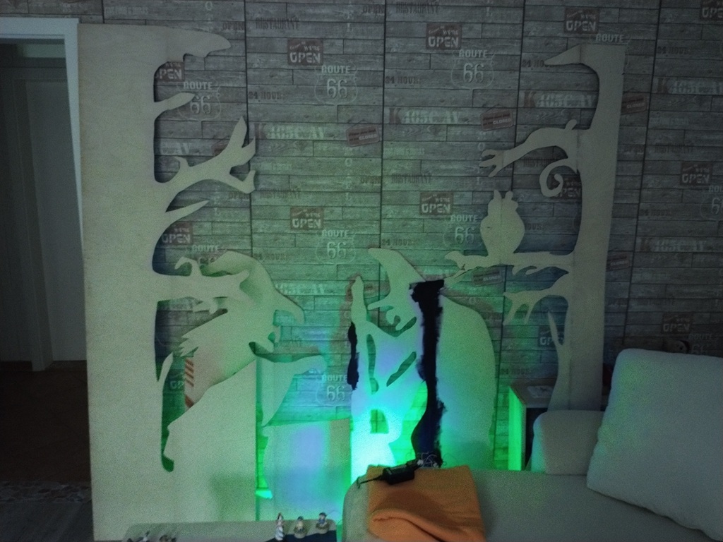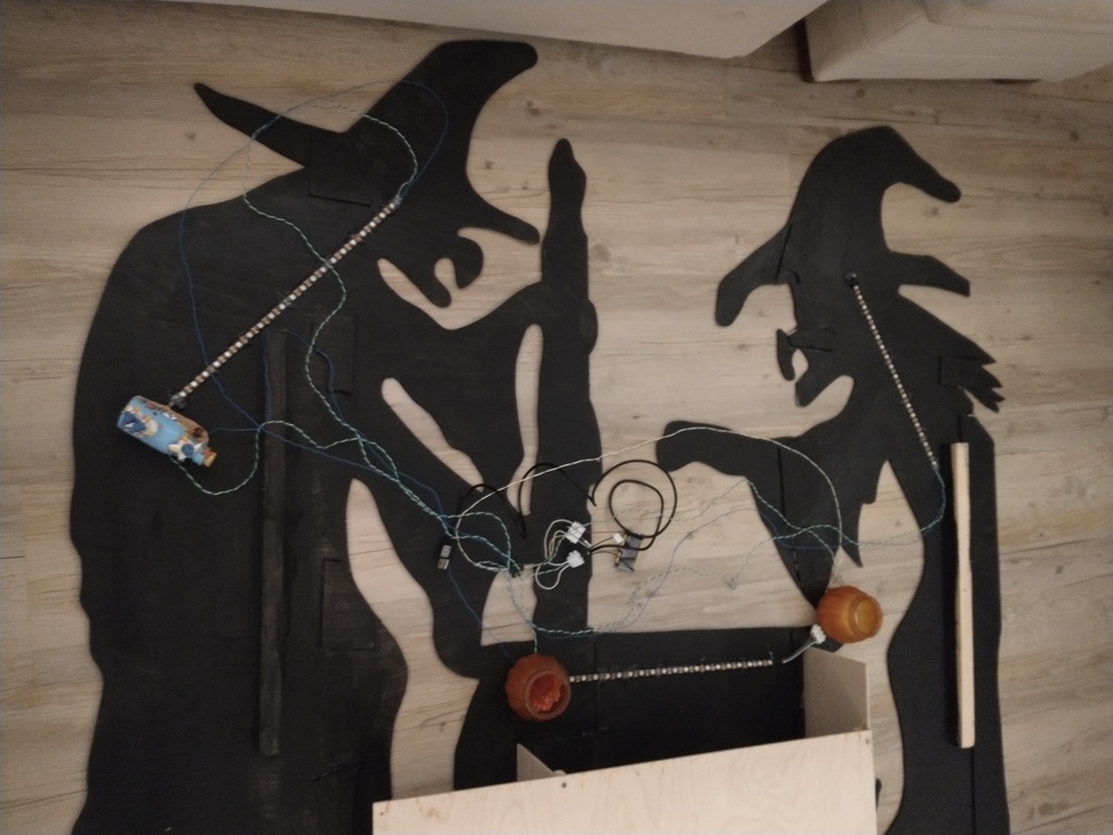 Dort ist auch ein Bewegungsmelder angeschlossen. Die LED's 'im Kessel' sollten bei Bewegung dann von Rot auf Giftgrün dimmen.