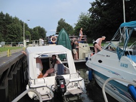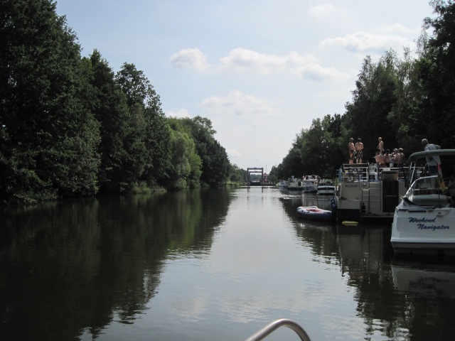 Hier aber, mitten im Führerscheinfreien Chartergebiet mit mächtig vielen Booten sind die Wartezeiten (es sind ja auch noch Ferien) doch mal länger. Vor der ersten Schleuse hier haben wir ca. 2,5 Stunden gewartet.
