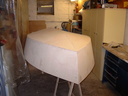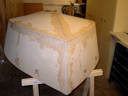 Als nächstes wird der ganze Rumpf mit Epoxy und Glasfasermatte laminiert.