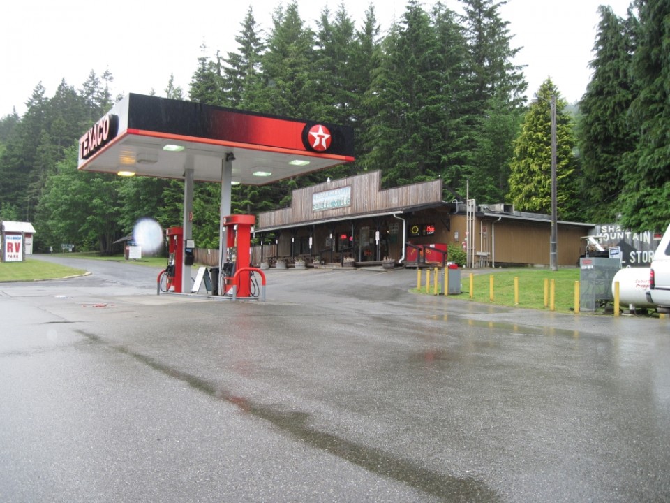 Nein, wir sind noch nicht im Regenwald. Aber meine Schwester wohnt ja in Paris und war total neidisch auf die tollen Regenschirme Ihrer Kolleginnen. Zum Glück gab es in Seattle den Laden ‚Bella Umbrella‘, in dem Sie sich dann dieses Modell ausgesucht hat.Und dann ist man auch schon ‚auf dem Land‘. Die Tanksäulen sind zwar neu, aber der Rest sieht dann aus, wie kurz nach der Besiedelung.